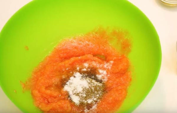 2. После к образовавшейся кашице добавляем оливковое масло, базилик, соль и перец. Всё перемешиваем до однородности. Если хотите, можете добавить ещё специй (кориандра, зиры и т. д.), но не стоит увлекаться. В основном, для этого рецепта, достаточно базилика, он хорошо гармонирует со свининой и подчеркивает вкус.
