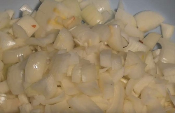 2. Лук нарезаем на большие кубики, можно также просто нарезать полукольцами. Складываем его пока в отдельную тару и переминаем руками, чтобы он пустил сок.