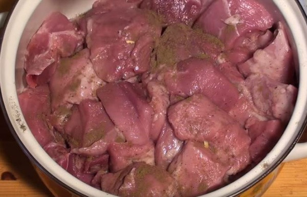 3. Теперь отправляем в общую тару измельчённый лавровый лист, само мясо и остальные специи. Тщательно перемешиваем содержимое. Позаботьтесь на данном этапе и о соли, если даже добавить немного больше, то ничего страшного.