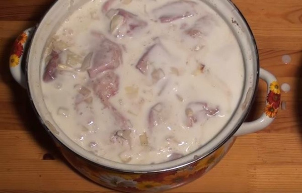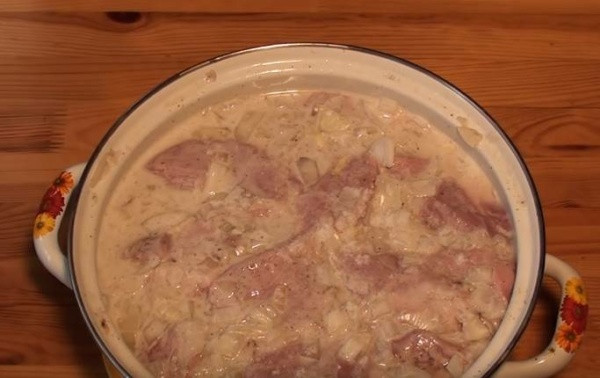4. Смешиваем вместе овощ и мясо, а потом добавляем кефир. Количество кисломолочного продукта может немного отличаться от заявленного, главное, чтобы жидкость покрывала все кусочки. В таком виде можно убрать кастрюлю в холодильник на 6-12 часов, но при нехватке времени достаточно оставить свинину при комнатной температуре на 2-3 часа.