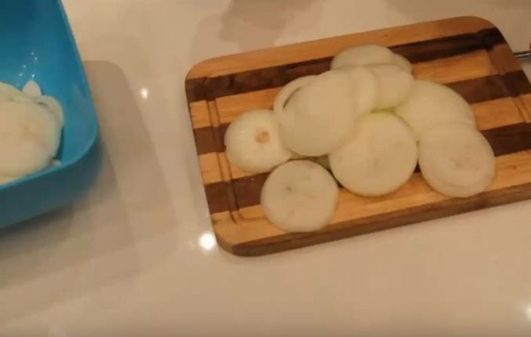 1. Лук очищаем от шелухи и нарезаем полукольцами. Складываем его пока в отдельную миску. Желательно нарезать не очень тонкими слайсами, чтобы потом можно было разместить овощ на шампуре и он не сгорел через минуту.