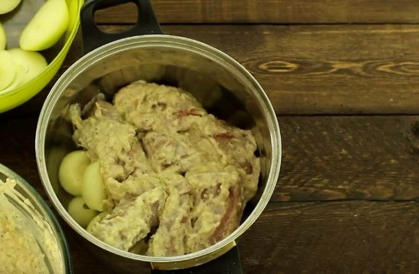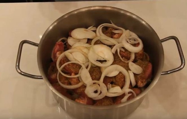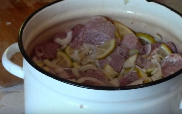 3. Далее берём глубокую кастрюлю и начинаем в неё выкладывать подготовленные продукты слоями. Последовательность слоёв следующая: мясо-лук-лимон и по новой. Свинину каждый раз солим, перчим и приправим. Когда же закладываем лук и лимон, пытаемся их в руках немного придавливать, чтобы начал выделяться сок. В конце, всё содержимое прижимаем руками, можно даже немного перемешать. Накрываем крышкой.