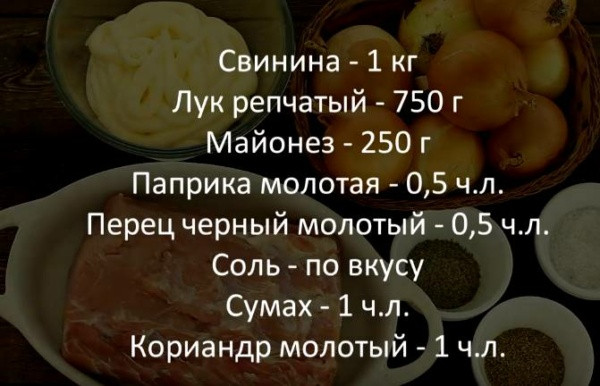 Такой вариант маринада считается более действенным по ряду причин: в составе майонеза уже есть уксус, масло, что ограждает нас от добавления других продуктов, ну кроме лука и специй. Данный рецепт хорошо подойдёт для сухого мяса (окорока, грудки).