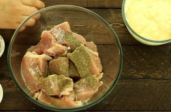 2. Следующим шагом нарезаем мясо. Его необходимо резать средними кусочками, иначе маленькие части пересохнут на огне. Отправляем свинину в миску и всыпаем туда все подготовленные специи и соль. Перемешиваем всё содержимое.