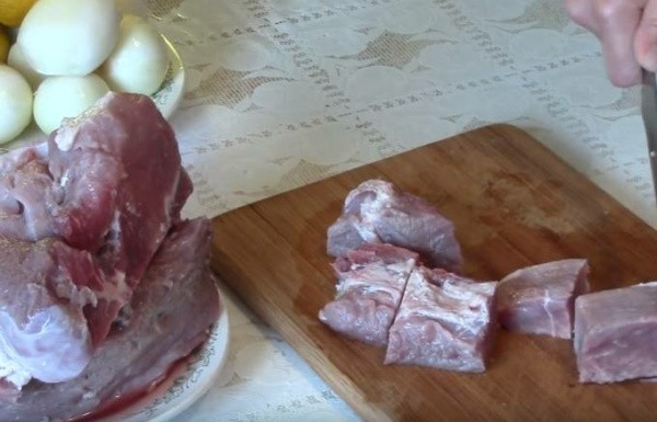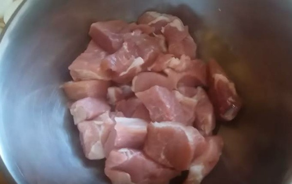 1. Нарезаем свинину на куски среднего размера. Учтите, что при жарке мясо имеет свойство уменьшаться, поэтому если Вы сделаете сильно маленькие кусочки, то в конечном итоге они у Вас будут сырыми. Также обрежьте возможные плёночки.