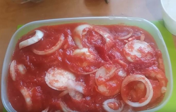1. Первым делом надо перекрутить на мясорубке томаты и лук. Помидоры надо брать спелые и сочные, заменить из можно перетертыми томатами, но лучше брать свежие овощи.
