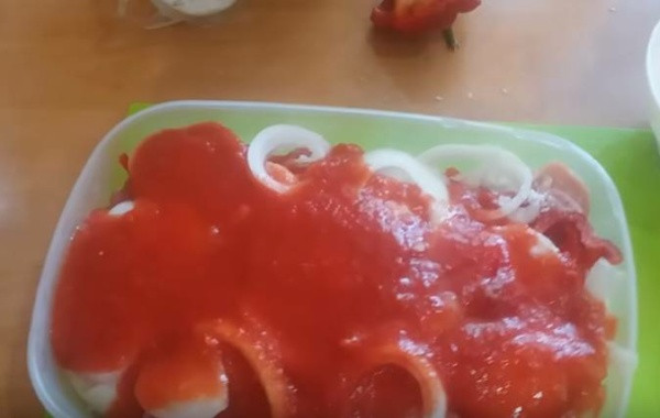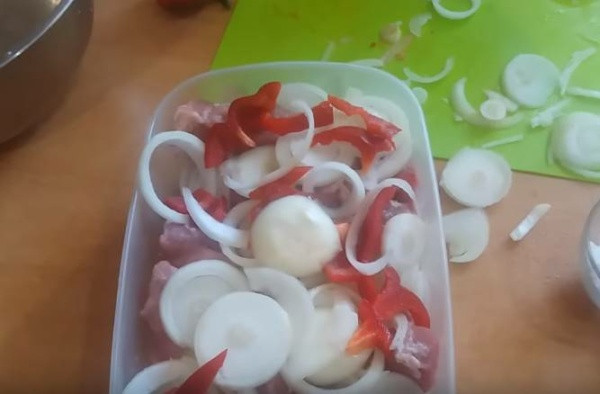 2. Добавляем к свинине соль, перец, специи (при желании) и перемешиваем. Затем нарезаем кольцами лук и часть выкладываем на дно ёмкости, где будет замачиваться мясо. Чередуем слои из лука и свинины пока не закончатся все ингредиенты. При желании сверху ещё можно положить болгарский перец.