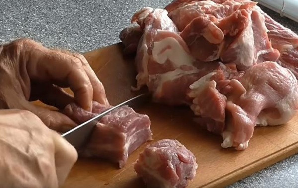 Важным моментом в этом дле является именно способ нарезки. Обязательно изначально надо резать мясо поперёк волокон, а потом уже на куски.
