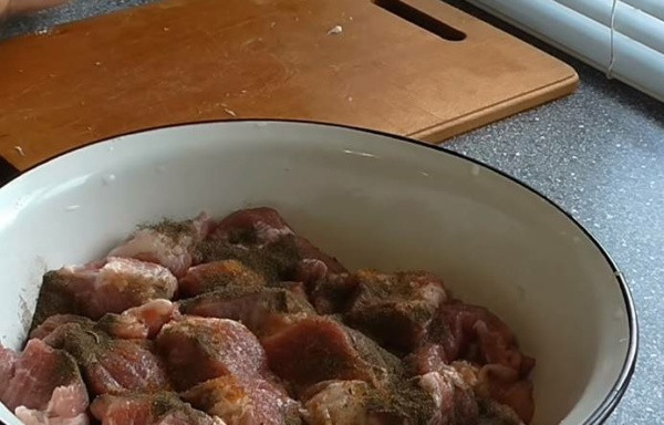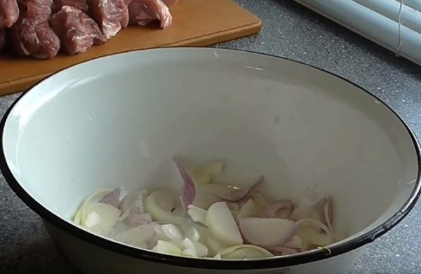 2. Мясо нарезаем на кусочки, примерно 50 на 50 мм. Жир не обрезаем! Теперь на дно кастрюли, где будем мариновать, выкладываем слой из третьей части лука, на него сверху кладём половину свинины. Солим перчим и добавляем специи, пока не перемешиваем.