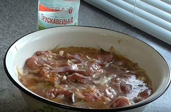 Данный рецепт маринада можно также отнести к быстрым. Благодаря минеральной воде, а точнее пузырькам, специи быстрее всасываются в мясо. Поэтому, если идея приготовить шашлык возникла спонтанно, можете свободно прибегнуть к этому варианту замачивания.