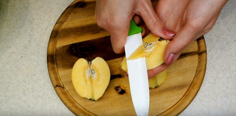 1. Для этого рецепта айву необходимо помыть под проточной водой и очистить от кожуры. Можно использовать обычную картофелечистку. Потом нужно разрезать фрукт, удалить сердцевину и нарезать дольками.