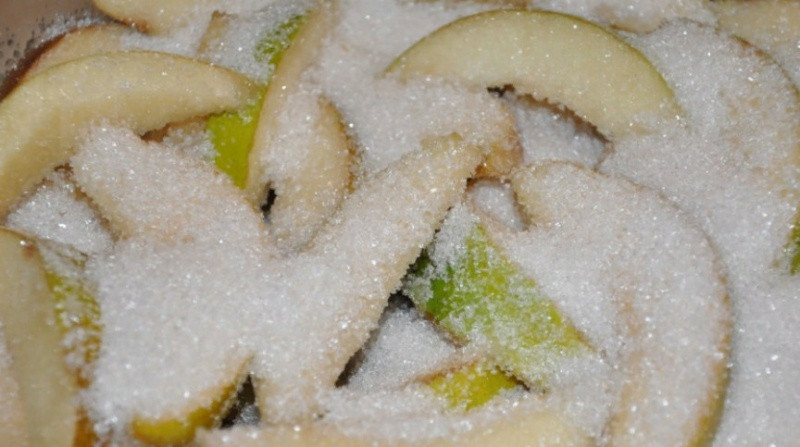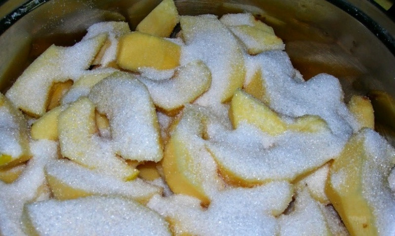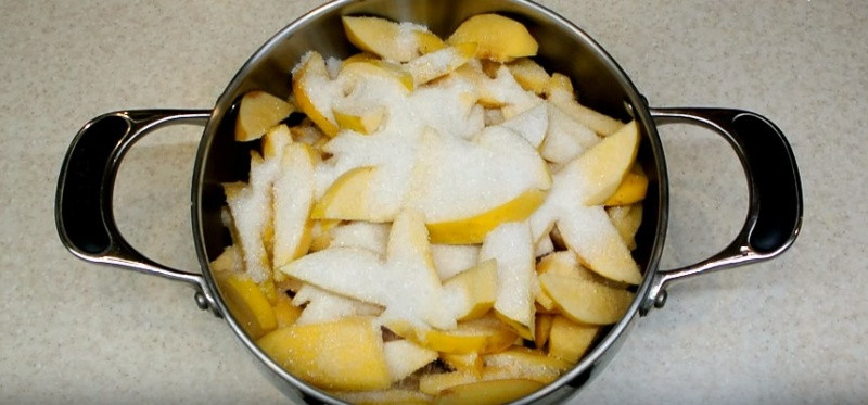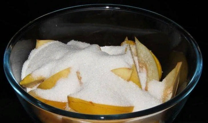 2. Теперь складываем нарезанные дольки в тару и засыпаем их сахаром. В таком виде айву нужно оставить на несколько часов. Необходимо дождаться, когда плоды пустят сок.