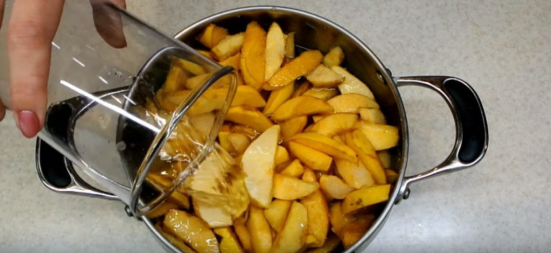 3. В случае, если айва мало пустила сок, а сахар почти растворился, то можно долить к долькам 300-400 мл воды. Стакан жидкости добавит количество сиропа в готовом варенье.