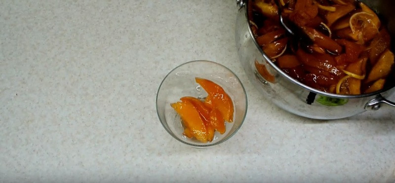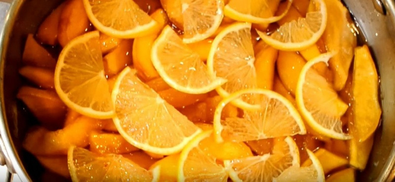 6. Перед тем, как прокипятить дольки в третий раз, добавляем нарезанный лимон. Доводим все до кипения, уменьшаем огонь и варим еще 5-7 минут. За это время цитрус успеет в полной мере отдать свой вкус и аромат.