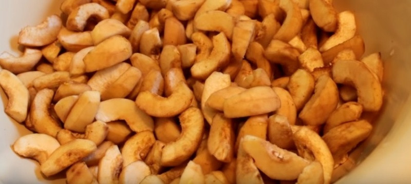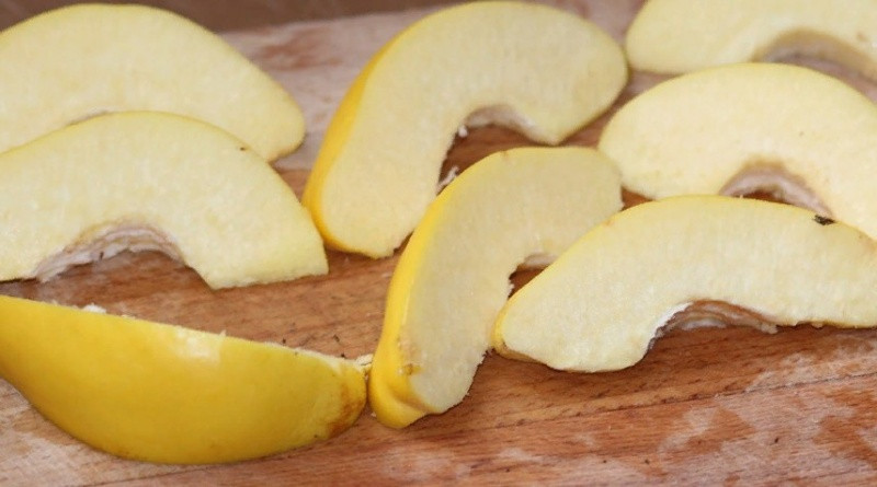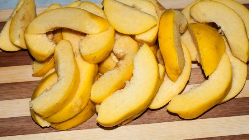 1. Начнем с выбора фрукта. Он должен быть спелым и упругим, красивого ровного цвета, без вмятен и гнили. Айву тщательно моем под проточной водой и хорошо обсушиваем. Затем разрезаем, убираем внутреннюю часть вместе с косточками и режем на некрупные кусочки либо тонкие дольки.