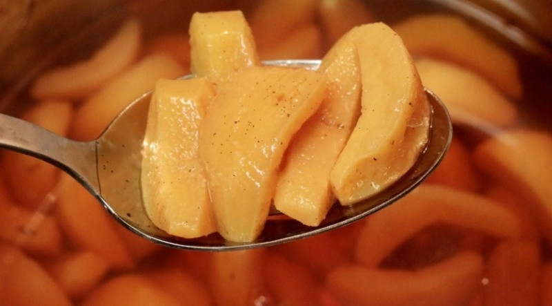Затем, варенье нужно отставить до полного остывания. Спустя время Вы сможете заметить, что дольки айвы стали твердыми. По тому же принципу провариваем и остужаем наш сладкий нектар 3 раза.