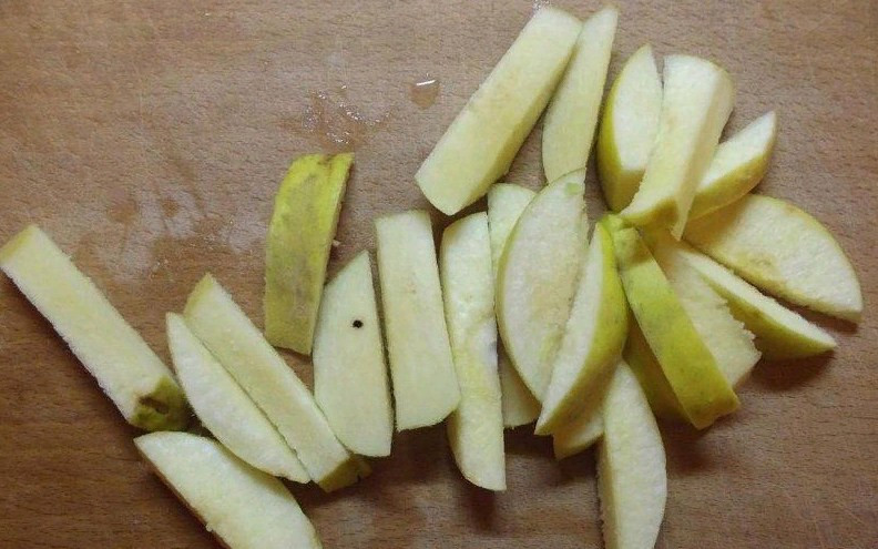 1. Плоды айвы нужно тщательно промыть. Затем разрезать на половинки, удалить сердцевину вместе с семечками и нарезать любым удобным для Вас способом. Я нарежу дольками, так аппетитнее.