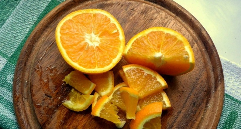 2. Подготовим апельсин. Возьмите цитрус среднего размера. Его нужно помыть и нарезать на кусочки. Также можете пропустить фрукт через мясорубку или измельчить в блендере.