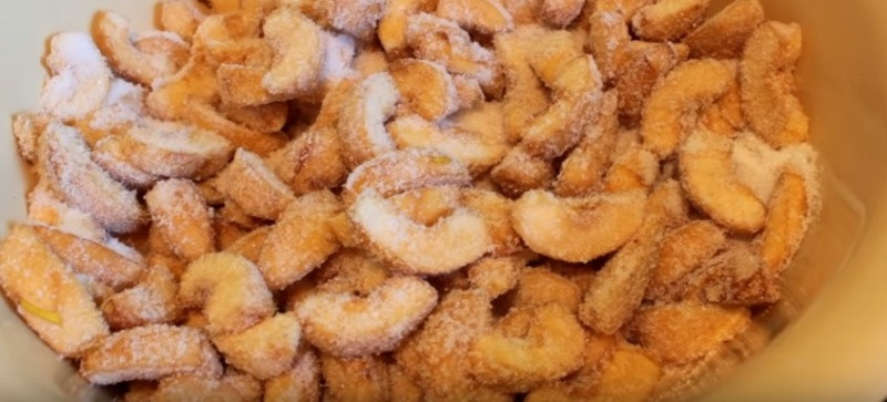 2. Когда айва полностью подготовлена ее нужно обсыпать сахаром. Нам потребуется 1 кг 200 г. Встряхивайте тару, чтобы в сахарном песке была каждая долька. В таком виде оставляем настаиваться 2 -3 часа.