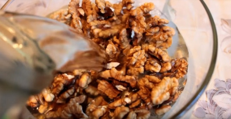 3. Пока наши дольки отдают сок подготовим грецкие орехи, нам потребуется всего 200 г. Их нужно очистить, удалить внутренние твердые части. Затем залить теплой водой и дать настояться. Это займет примерно 2,5 часа. Потом орехи нужно промыть и обсушить.