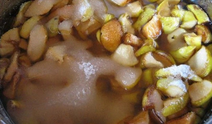 2. Итак, фрукт почищен и нарезан. Можете сначала обсыпать айву сахаром и оставить на несколько часов. Сахар запустит процесс выделения сока. В таком случае вода может и не понадобиться (если сока будет достаточно). Если нет желания заморачиваться, то просто добавьте к долькам сахар с водой и продолжайте готовить.