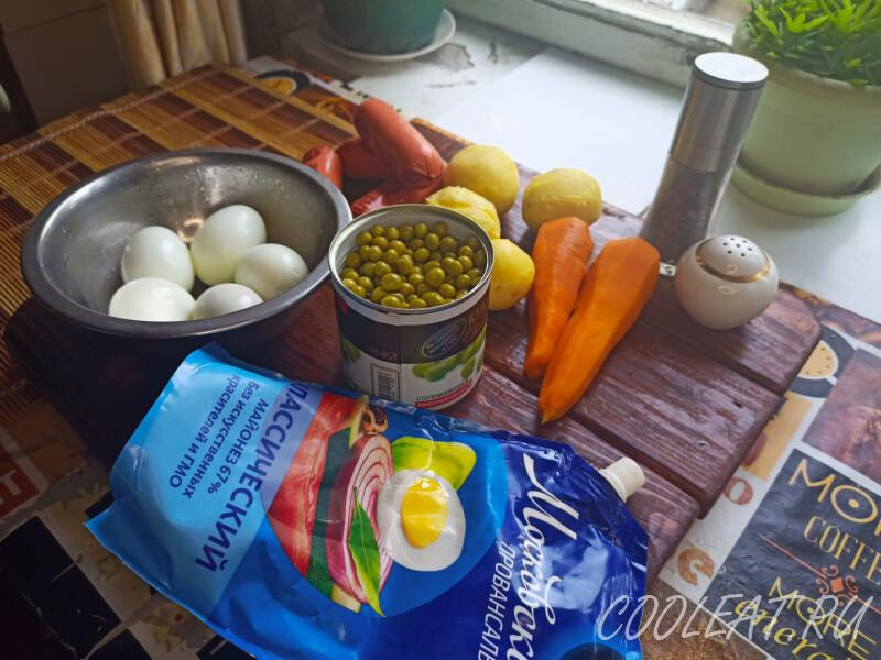Как Вы могли заметить, в рецепте я использую сардельки. В этом нет ничего страшного, просто у меня на тот момент были только они. Вы же можете взять обычную вареную колбасу или заменить её варёно-копчёной. В последнем случае вкус получится немного непривычным, что сделает салат отличным от оригинала. Также за мясную составляющую сойдёт отварная куриная грудка. Тут уже больше на любителя.