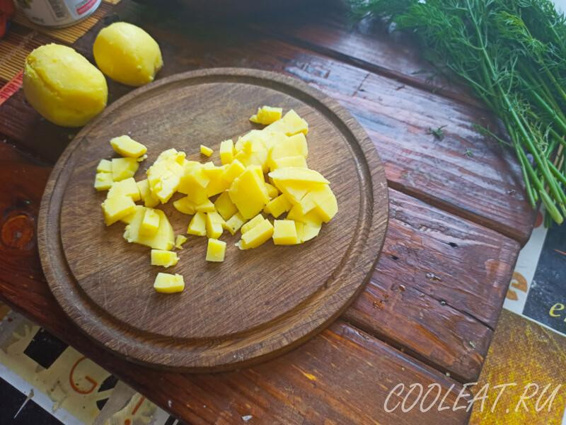 Шаг 1. Отварной картофель нарезаем кубиком среднего размера. Сильно крупно или мелко стараемся не резать. В первом случае структура салата получит грубую форму, а во втором станет кашеобразной. Придерживайтесь размера консервированного горошка. Так вкус оливье станет единым и не будет выделяться конкретный продукт.