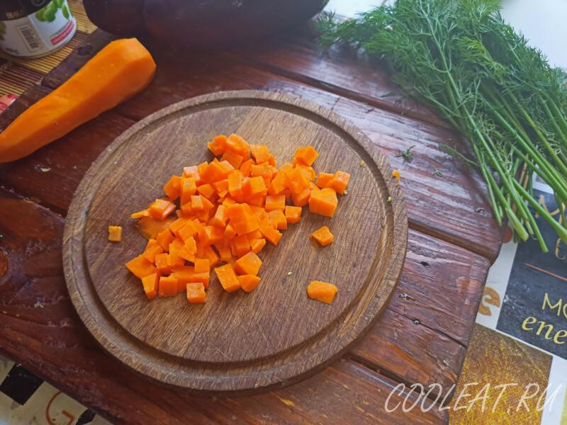 Шаг 2. Морковь режем аналогично картофелю. В случае, если Вы по какой-то причине не любите этот овощ, можете вовсе его не использовать. Но учтите, морковка придаёт закуске небольшую сладость, которая балансирует её вкус.