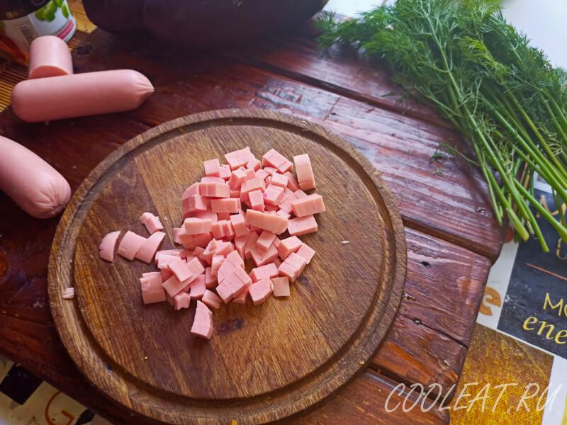 Шаг 3. Колбасу мы тоже режем на небольшие кубики.