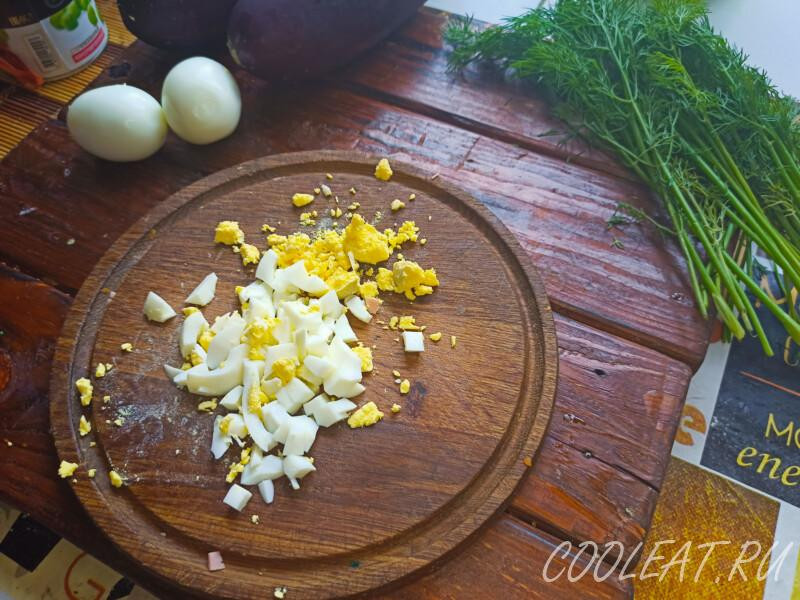 Шаг 4. 3 отварных яйца можем просто мелко накрошить, не придерживаясь основной нарезки. Главное, не делать куски крупнее горошка.