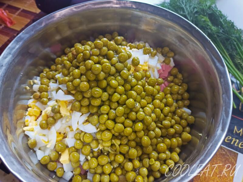 Кстати, горошек рекомендую брать мозговых сортов и не самый дешёвый. В противном случае получите грубый продукт, который будет очень сильно выделяться в салате.