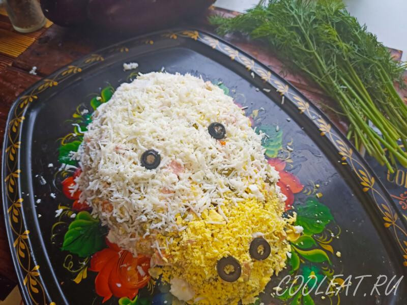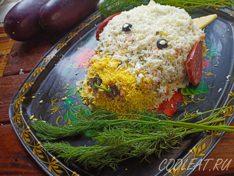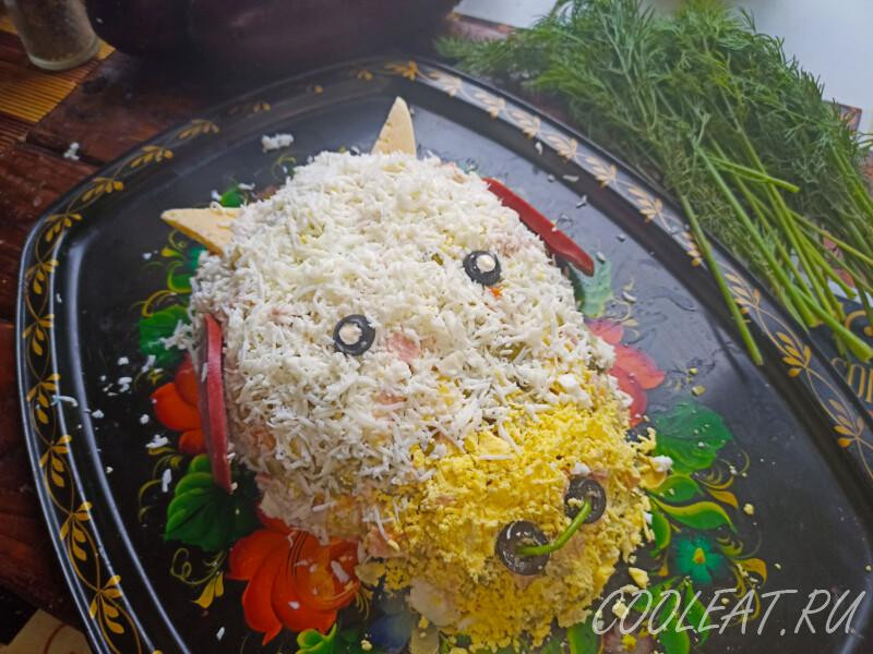 Что касается самой основы, то здесь тоже много места для экспериментов. Как вариант, Оливье можно попробовать сложить слоями, придавая ему форму головы животного. Получится привычный салат, но новом свете. Либо приготовить вообще Крабовый или Мимозу. Последнее так вообще очень подходит по оформлению, ведь крайний слой делается из желтков и белков.
