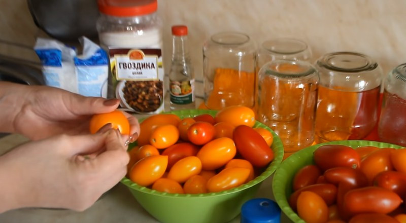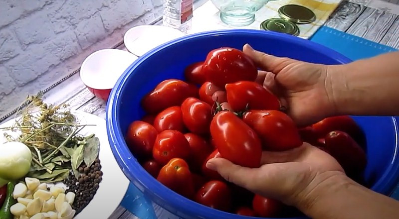 1. Для начала подготовим все необходимые продукты. Помидоры для консервирования рекомендуется выбирать плотные, без вмятин. Тщательно промываем их в нескольких водах. Наличие даже минимальных загрязнений при консервировании недопустимо.
