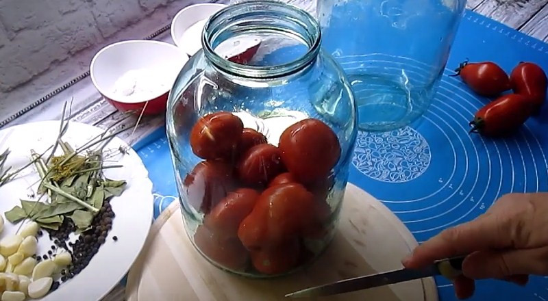 - Чтобы помидоры не лопнули, когда их будут заливать кипятком, их рекомендуется проколоть вилкой или зубочисткой около плодоножки.