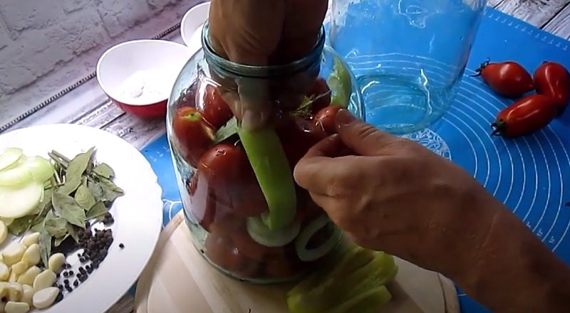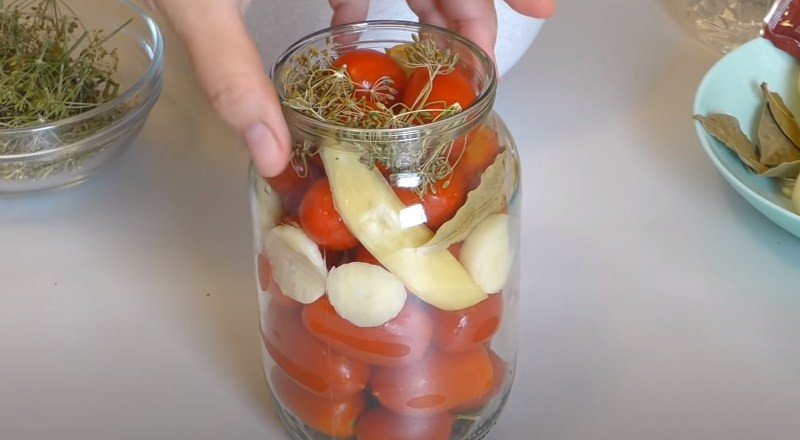 3. Закладываем помидоры примерно на половину емкости. Сюда же всыпаем нарезанные на тонкие кусочки дольки чеснока и болгарского перца. Приправляем все лавровым листиком для аромата. И докладываем еще помидоров до конца банки. Все пустоты заправляем веточками укропа.