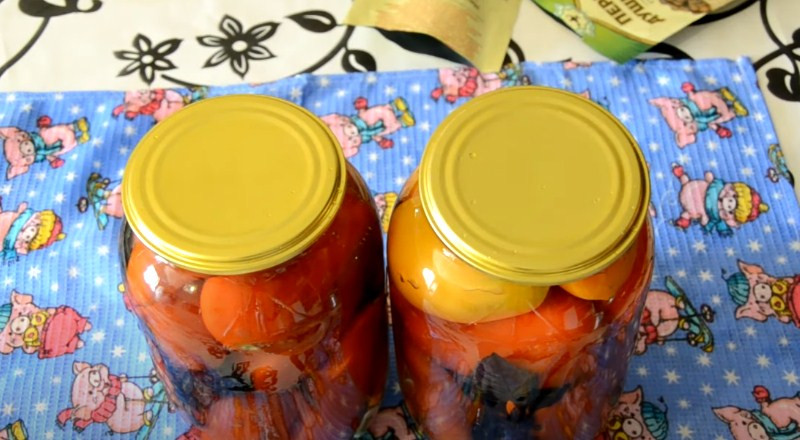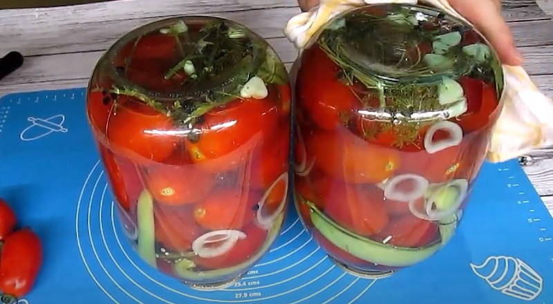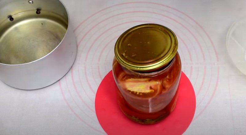 6. Воду с помидоров сливаем, она нам больше не понадобится. И заливаем наши овощи кипящим сиропом. Заключительный момент — необходимо закрыть стерильными крышками банки. Далее переворачиваем закрутку вверх дном и укрываем теплым одеялом или полотенцем. Хранить подобную консервацию рекомендуется в темном месте при комнатной температуре.