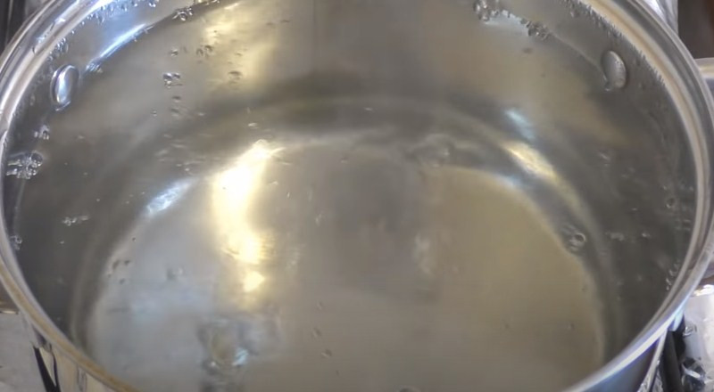 4. На плиту ставим большую кастрюлю и наливаем в нее воду в расчете 500 мл на одну литровую банку. На отдельной конфорке доводим до кипения закаточные железные крышки.