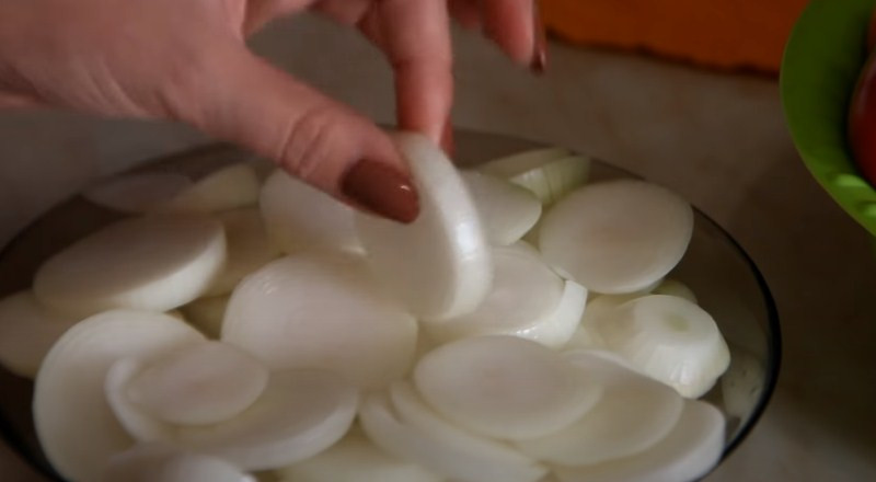 2.Луковицы режем на кружочки средней толщины. Слишком мельчить не нужно, чтобы они не растворились в готовой закрутке, да и просто лучше смотрелись в банке.