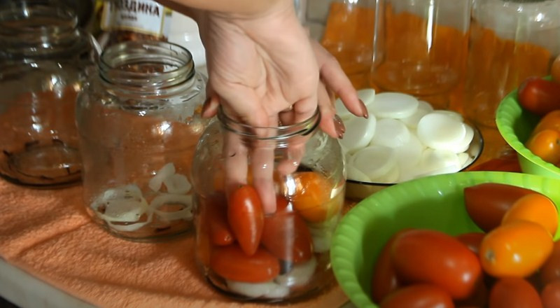 3. Все компоненты готовы, а это значит, можно начинать раскладку. На дно банки бросаем несколько сушеных гвоздик, чтобы готовые помидоры приобретали особый пряный аромат. Теперь выкладываем наши овощи: сначала лук, потом помидоры. Можно распределять репчатый лук по краям емкости, но мне больше нравится слоями.