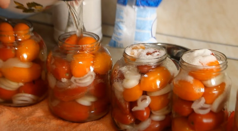 3. Сливаем с банок воду и растворяем в ней соль и сахар. Снова покрываем помидоры получившимся сиропом. Последний компонент — уксусная эссенция. Накрываем емкости предварительно простерилизованными крышками и закатываем. Все готово!