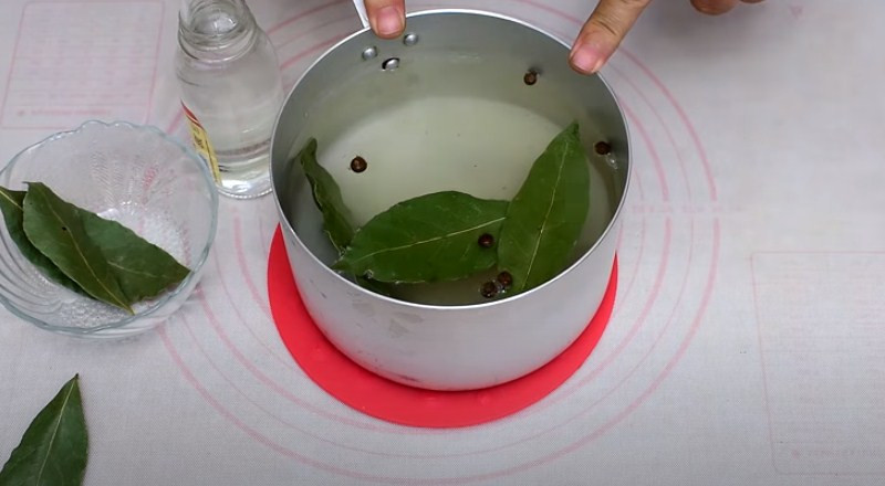 2. Теперь подготовим рассол. Для этого ставим на плиту кастрюлю с водой, а в нее уже кладем душистый перец горошком, несколько лавровых листиков и всыпаем соль и сахар. Когда вода закипит, можно вливать в рассол уксусную эссенцию и выключаем огонь. Оставляем рассол остывать, чтобы не ошпарить помидоры.