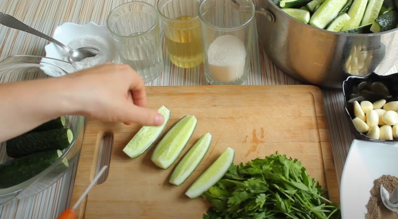 1. Промытые и замоченные огурцы нарезаем на четвертинки, предварительно отрезав у них кончики, и перекладываем в кастрюлю, где будем в дальнейшем мариновать.