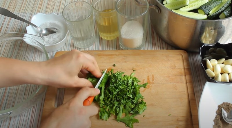 3. Чеснок чистим и также мелко нарезаем. После чего перекладываем его к огурцам с петрушкой.