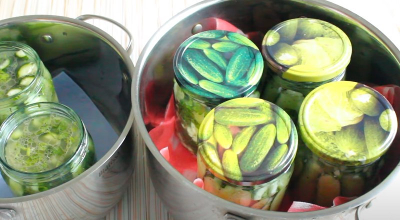 6. Далее будем стерилизовать огурцы. Для этого берём глубокую кастрюлю, застилаем её дно полотенцем, выставляем туда банки и прикрывает крышками (не закрываем).