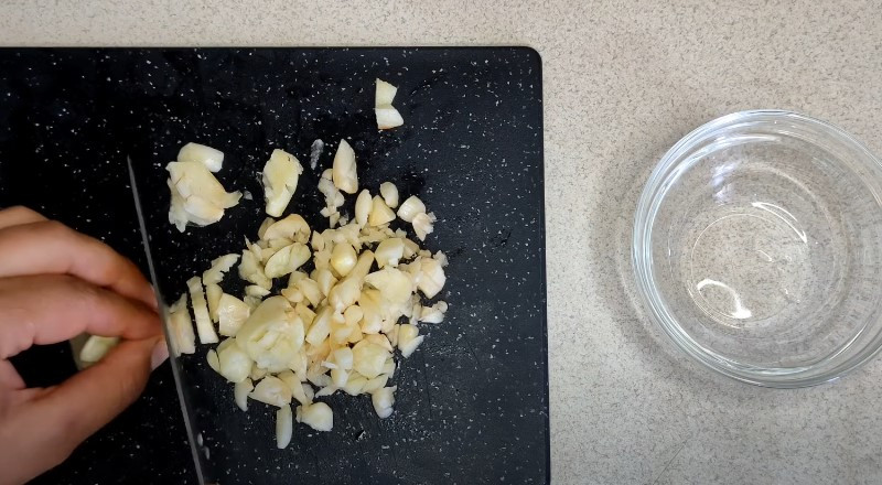 4. Чеснок очищаем от кожуры, давим каждый зубчик плоской стороной ножа и нарезаем не слишком мелко.