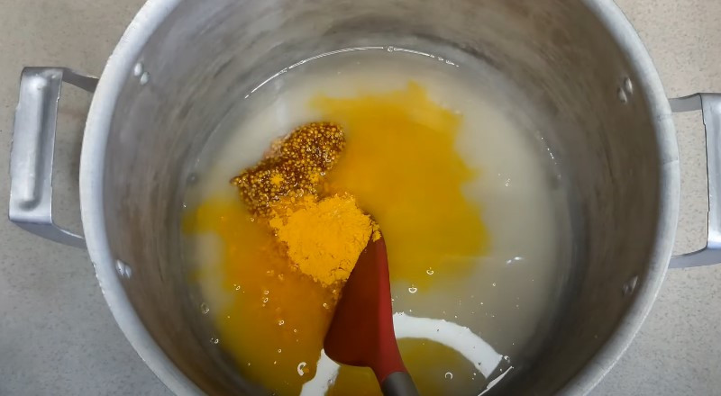 5. Теперь приготовим маринад. Для этого в глубокую кастрюлю всыпаем сахар, соль, вливаем столовый уксус 9%, добавляем горчицу в зернах и куркуму. Все хорошо перемешиваем, ставим на плиту и на среднем огне доводим до кипения.