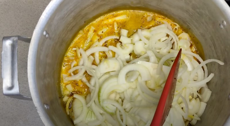 6. После того, как маринад закипел, в кастрюлю закидываем лук и провариваем в течение 5 минут.