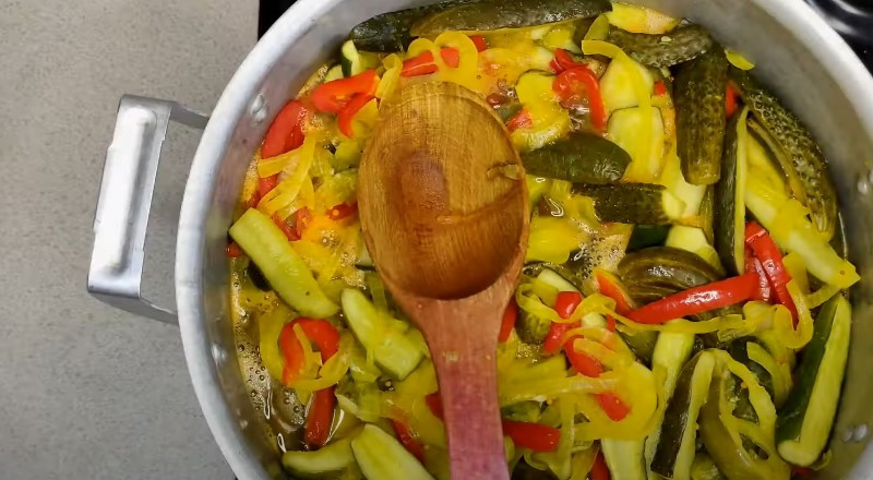 8. Пришло время добавить огурцы. Их хорошо смешиваем с остальными ингредиентами в кастрюле и варим на умеренном огне до тех пор, пока зеленцы не изменят свой цвет. В среднем этот процесс займет 10-15 минут.