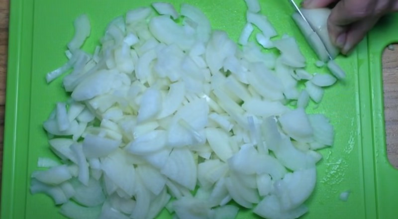 2. Затем берем репчатый лук, очищаем его и нарезаем четверть или полукольцами.
