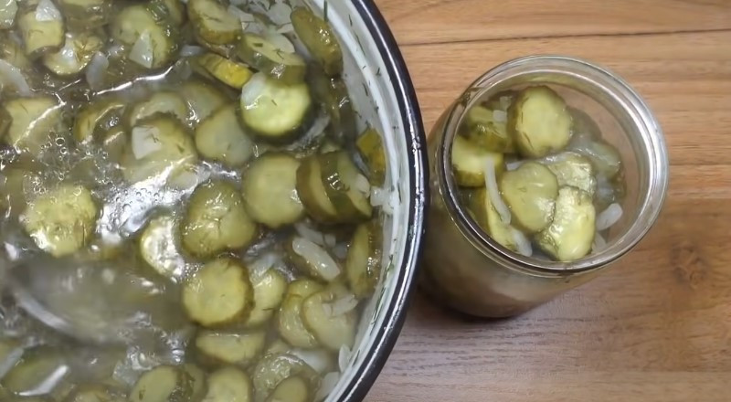 Когда огурцы изменят свой цвет на желто-зеленый, выключаем огонь и снимаем кастрюлю с плиты.
